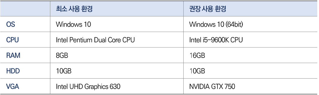 소프트웨어 사용을 위한 최소/권장 환경은 다음과 같습니다.