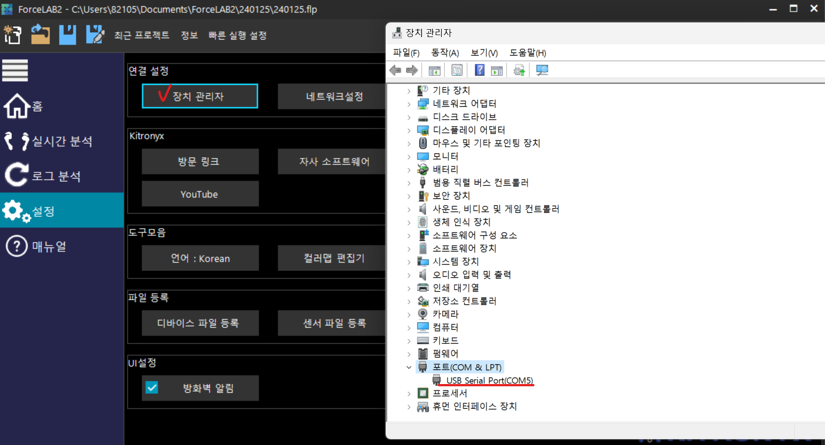 COM Port 확인 방법 : 설정 -> 장치 관리자 -> 포트(COM & LPT)