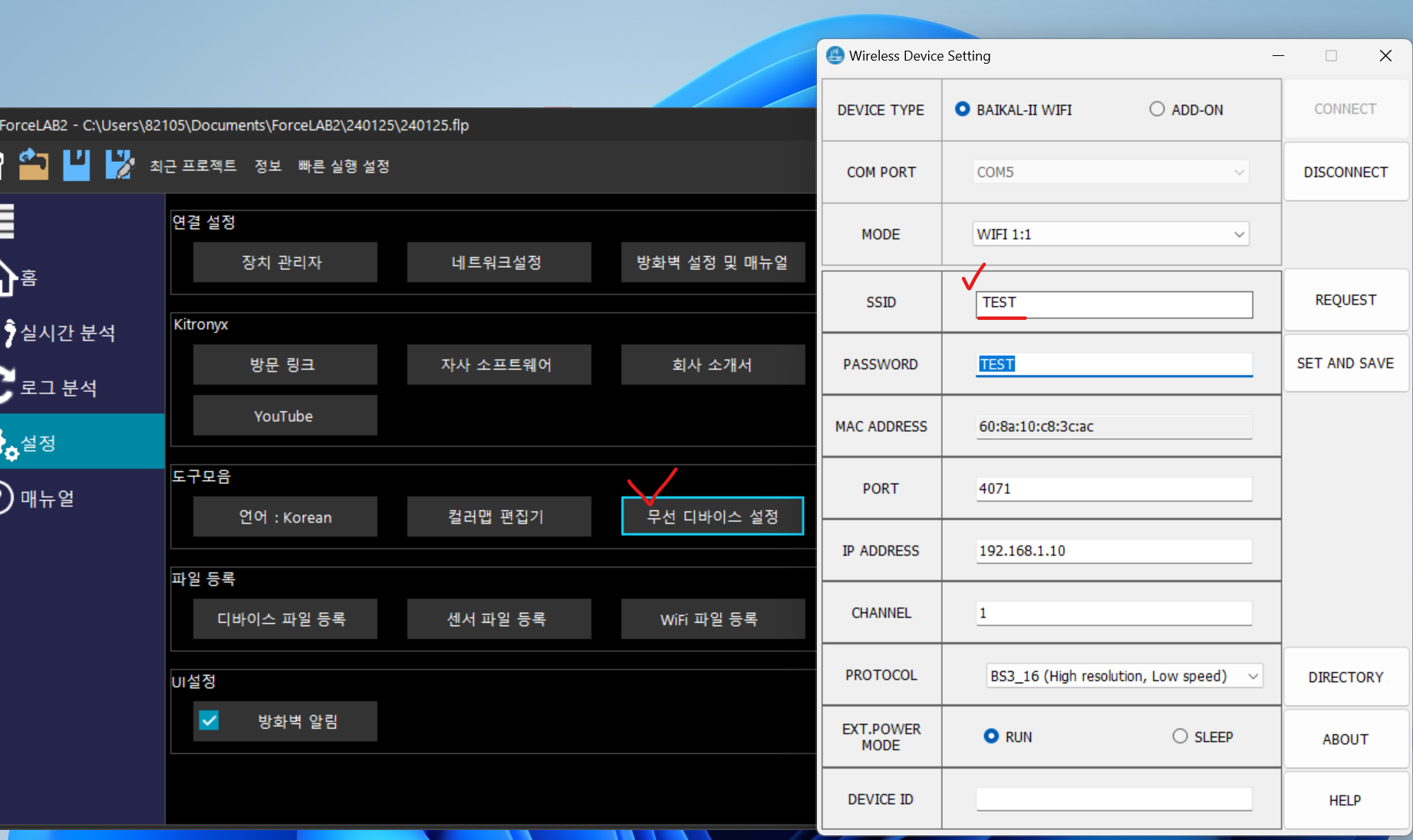 SSID 확인 및 설정 방법 : ForceLAB2 -> 설정 -> 무선디바이스 설정